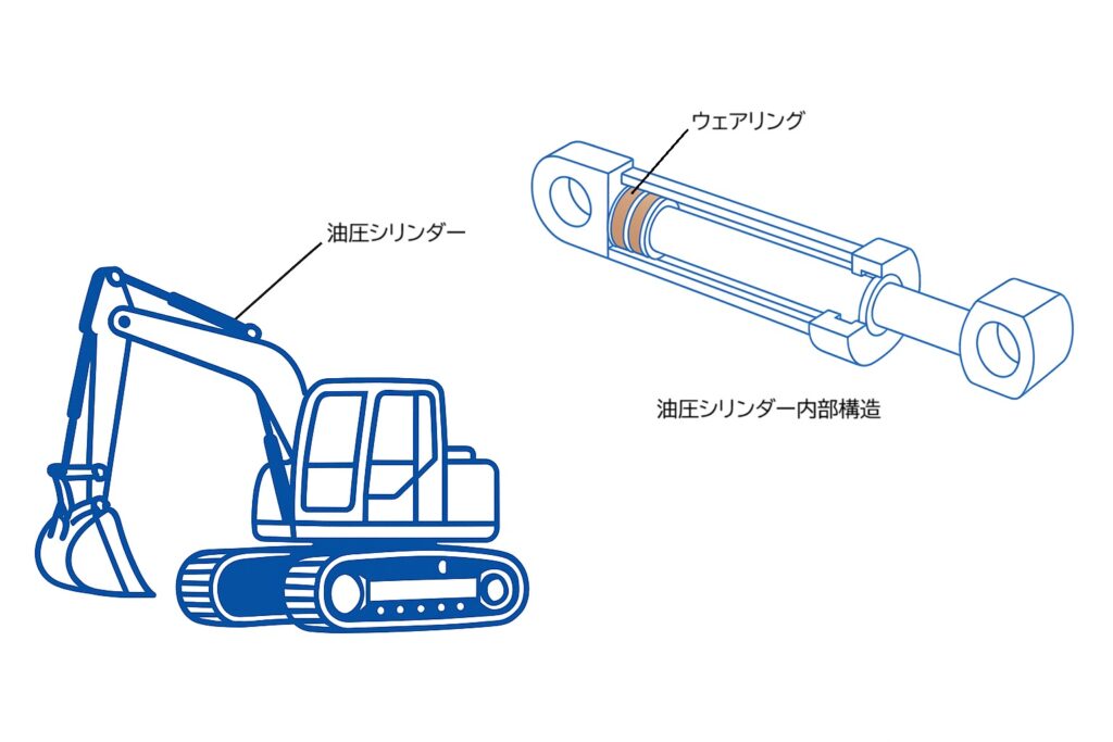 シリンダー内部のピストン部およびロッド部の軸受として使用し、焼き付きやカジリ、偏心を防止し、